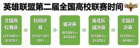 经过近阶段的筹备,《英雄联盟》第二届全国高校联赛即将开启。此番赛事随着赛制变化及《英雄联盟》2014赛季的到来(S4),将会有全新的体验。赛事时间将调整为校园学年制——每个学年(9月至次年5月),高校战队需经过海选赛、校间决赛、省决赛到南北决赛,最终进入全国总决赛。12月14日,《英雄联盟》第二届全国高校联赛面向所有高校学子陆续开放报名,每一位拥有竞技梦的高校玩家都有机会实现自己的梦想,一展校园青春气息的竞技风采。